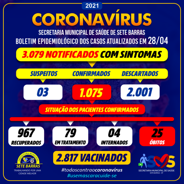 A Secretaria Municipal de Saúde e a Vigilância Epidemiológica de Sete Barras apresentam os números da COVID-19 dessa quarta-feira, 03 casos suspeitos em isolamento domiciliar, 1.075 confirmados e 2.001 descartados. Dos 1.075 confirmados, 79 em quarentena (tratamento domiciliar), 967 recuperados, 4 internados e 25 óbitos.