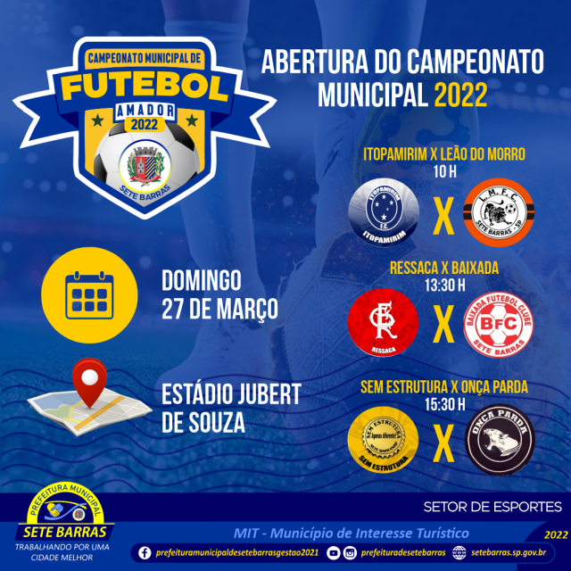 A Prefeitura de Sete Barras a o Departamento de Esportes informam que o Campeonato Municipal de Futebol Amador 2022, terá início no próximo fim de semana, dia 27 de março, às 10h, no Estádio Jubert de Souza. O jogo de abertura será entre as equipes Itopamirim e Leão do Morro.