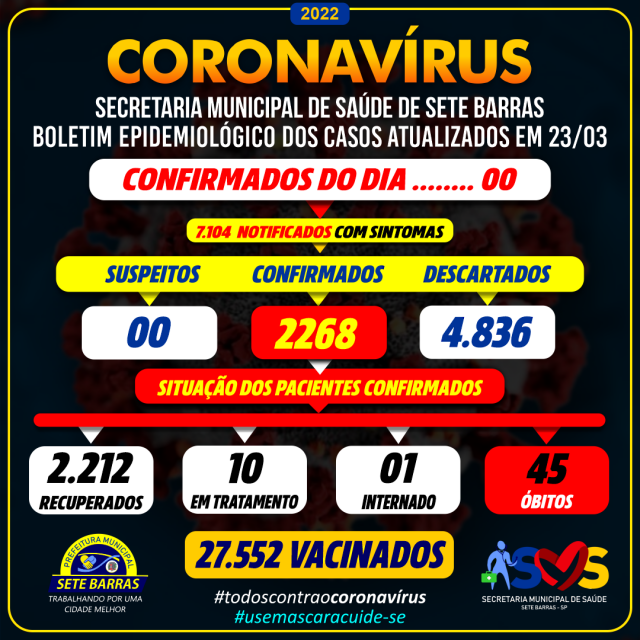 A Secretaria Municipal de Saúde e a Vigilância Epidemiológica de Sete Barras apresentam os números da COVID-19 de quarta-feira, sem casos suspeitos, 2.268 confirmados e 4.836 descartados. Dos 2.268 confirmados, 10 em quarentena (tratamento domiciliar), 2.212 recuperados, 01 internado e 45 óbitos. Já foram imunizados no município 27.552 pessoas.