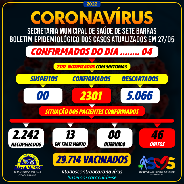 A Secretaria Municipal de Saúde e a Vigilância Epidemiológica de Sete Barras apresentam os números da COVID-19 desta sexta-feira, sem casos suspeitos, 2.301 confirmados e 5.066 descartados. Dos 2.301 confirmados, 13 em quarentena (tratamento domiciliar), 2.242 recuperados e 46 óbitos.
