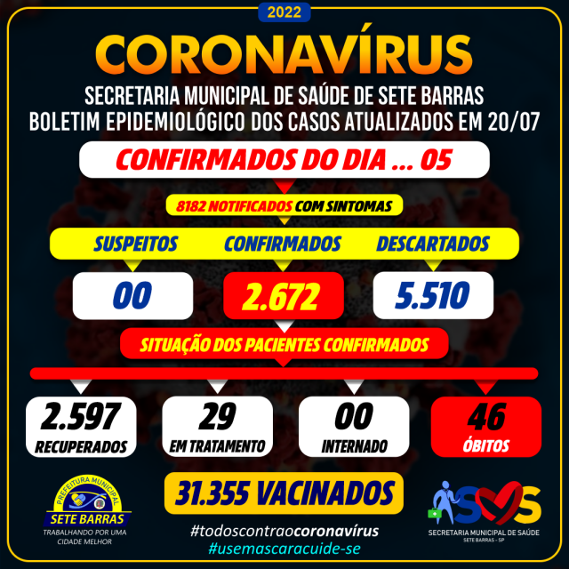 A Secretaria Municipal de Saúde e a Vigilância Epidemiológica de Sete Barras apresentam os números da COVID-19 nesta quarta-feira, sem casos suspeitos, 2.672 confirmados e 5.510 descartados. Dos 2.672 confirmados, 29 em quarentena (tratamento domiciliar), 2.597 recuperados e 46 óbitos.
