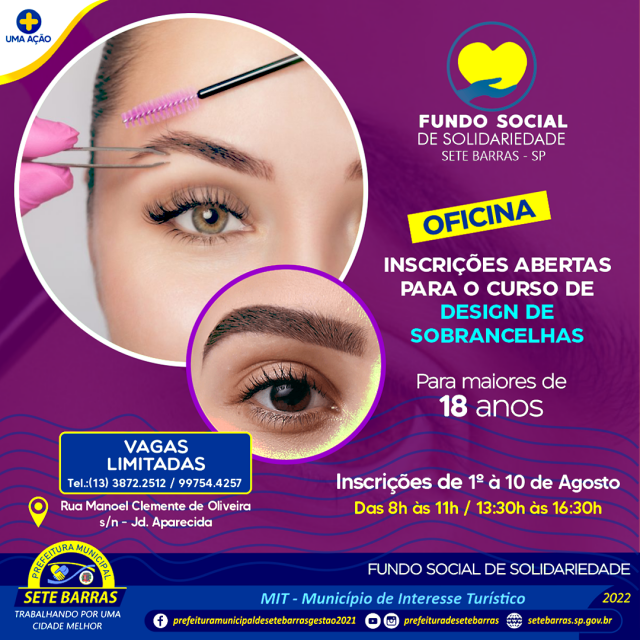 O Fundo Social de Solidariedade de Sete Barras informa que estarão abertas as inscrições para o Curso de Design de Sobrancelhas (a partir dos 18 anos). Os interessados devem se dirigir ao Fundo Social entre 1º a 10 de agosto, das 8h às 11h e das 13h30 às 16h30, na Rua Manoel Clemente de Oliveira, s/n, Jardim Aparecida.