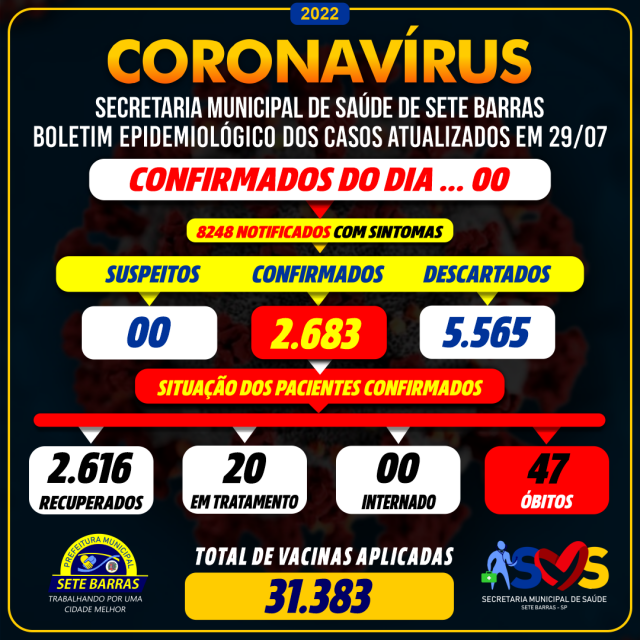 A Secretaria Municipal de Saúde e a Vigilância Epidemiológica de Sete Barras apresentam os números da COVID-19 nesta sexta-feira, sem casos suspeitos, 2.683 confirmados e 5.565 descartados. Dos 2.683 confirmados, 20 em quarentena (tratamento domiciliar), 2.616 recuperados e 47 óbitos.