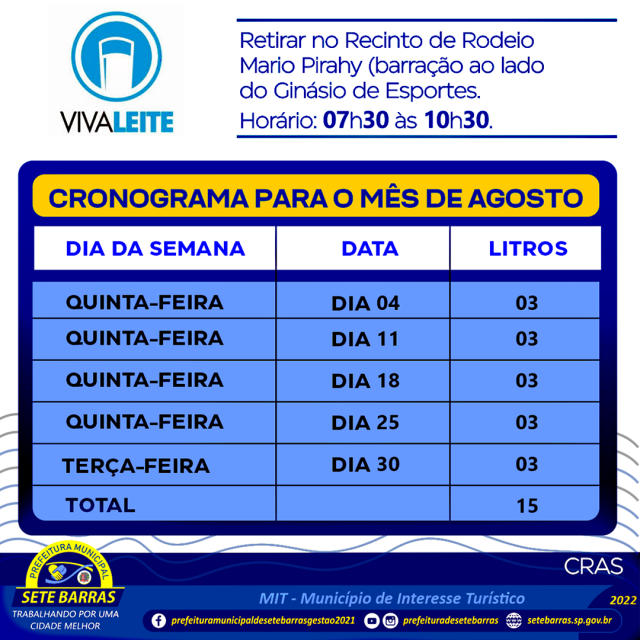 A Prefeitura Municipal de Sete Barras por meio da Secretaria de Assistência Social e CRAS informa que, a entrega do leite aos beneficiários do programa Vivaleite ocorrerá a partir do dia 04 de Agosto, quinta-feira, a retirada será no Recinto de Rodeio Mario Pirahy (barracão ao lado do Ginásio de Esportes), das 07h30 às 10h30.