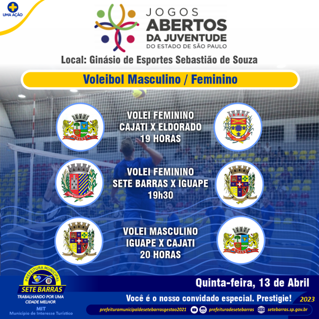 Na quinta-feira, 13 de abril, Sete Barras recebe no Ginásio de Esportes Sebastião de Souza, jogos de Voleibol sediando os Jogos Abertos da Juventude do Estado de São Paulo.