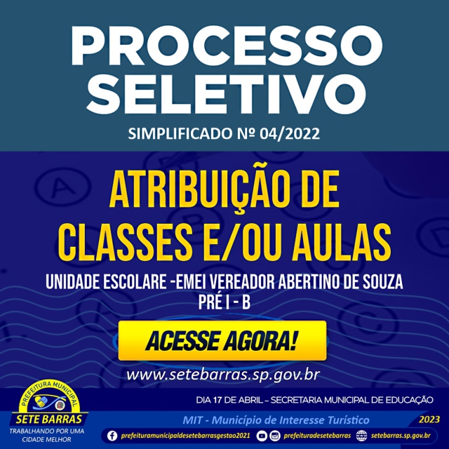 A Secretária Municipal de Educação, no uso de suas atribuições e de acordo com o Edital do Processo Seletivo Simplificado n.º 04/2022, Os candidatos serão convocados através de Edital publicado com pelo menos 24 (vinte e quatro) horas de antecedência, afixados no site da Prefeitura Municipal (www.setebarras.sp.gov.br), Mural da Secretaria Municipal de Educação e Mural das Escolas da Rede Municipal de Ensino de Sete Barras, sendo que o não comparecimento implicará em sua eliminação, torna pública a Sessão de Atribuição de Classes/Aulas a ser realizada na Secretaria Municipal de Educação, situada à Rua Dr. Júlio Prestes, 692 Centro, no dia 17 de Abril a partir das 9h, para a Unidade Escolar EMEI Vereador Abertino de Souza (Pré I B).