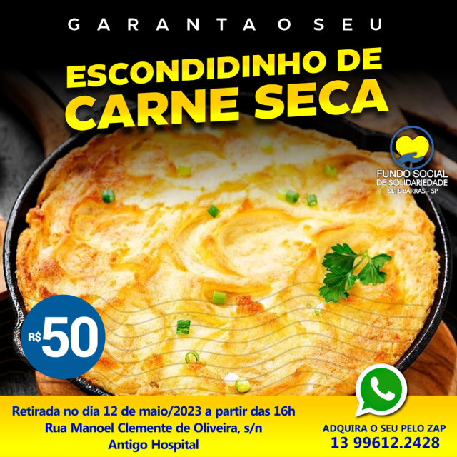 O Fundo Social de Solidariedade de Sete Barras na busca do atendimento as famílias em vulnerabilidade social, promove no dia 12 de maio, a venda de deliciosos escondidinhos de carne seca.