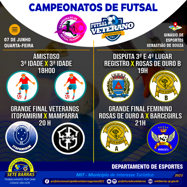Na próxima quarta-feira, 07 de junho, O Ginásio Poliesportivo Sebastião de Souza será palco da grande final dos Campeonatos de Futsal nas categorias Veteranos e Feminino, com abertura às 18 horas entre as equipes da Melhor Idade de Sete Barrense, demonstrando muita saúde e vitalidade, abrilhantando o campeonato.