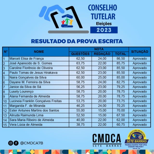 A Comissão Eleitoral do Processo Seletivo do Conselho Tutelar em parceria com a Secretaria de Assistência Social de Sete Barras divulgam o resultado da prova dos candidatos ao cargo de Conselheiro Tutelar do município, realizada no domingo, 10 de junho, na Escola Durval de Castro.