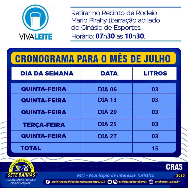A Prefeitura Municipal de Sete Barras por meio da Secretaria de Assistência Social e CRAS informa a entrega do leite aos beneficiários do programa Vivaleite, que ocorrerá a partir do dia 6 de julho, quinta-feira, a retirada será no Recinto de Rodeio Mario Pirahy, (Barracão ao lado do Ginásio de Esportes), das 07h30 às 10h30.