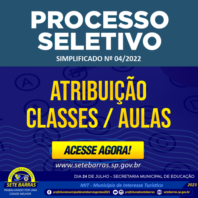 A Secretária Municipal de Educação, no uso de suas atribuições e de acordo com o Edital do Processo Seletivo Simplificado n.º 04/2022, Os candidatos serão convocados através de Edital publicado com pelo menos 24 (vinte e quatro) horas de antecedência, afixados no site da Prefeitura Municipal (www.setebarras.sp.gov.br), Mural da Secretaria Municipal de Educação e Mural das Escolas da Rede Municipal de Ensino de Sete Barras, sendo que o não comparecimento implicará em sua eliminação, torna pública a Sessão de Atribuição de Classes/Aulas a ser realizada na Secretaria Municipal de Educação, situada à RUA DR. JULIO PRESTES, 692 Centro - Sete Barras/SP, será realizada no dia 24 de Julho às 09 horas, para as seguintes Unidades Escolares: