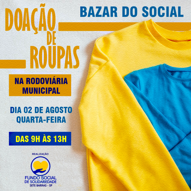 O Fundo Social de Solidariedade de Sete Barras promoverá na próxima quarta-feira, 02 de Agosto das 9h às 13h, o Bazar do Fundo Social, a ação visa doar roupas de forma gratuita às famílias em vulnerabilidade social.
