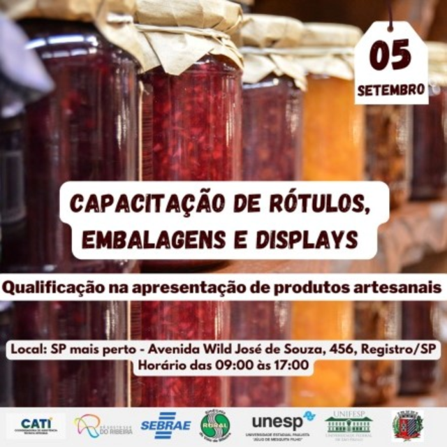 O SEBRAE informa que estão abertas as inscrições para a Capacitação de Rótulos, Embalagens e Displays, as vagas são limitadas, os interessados deverão acessar o link: https://forms.office.com/r/8xyC0FUtdJ, a capacitação será no dia 05 de setembro na Avenida Wild José de Souza, nº 456 na cidade de Registro, das 9h às 17h.
