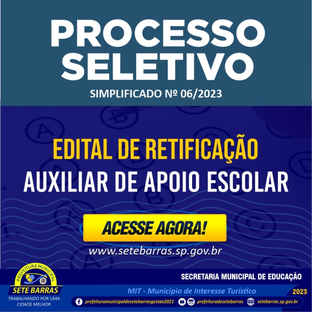 O Prefeito do Município de Sete Barras (SP), no uso de suas atribuições legais, pelo presente Edital de Retificação ao Processo Seletivo Simplificado n.º 006/2023, cujo objeto versa sobre o Processo Seletivo Simplificado de Análise de Currículos vem por meio deste, RETIFICAR as datas.