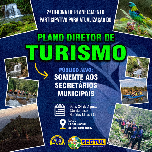 A SECTUL Secretaria de Cultura, Turismo, Lazer e Esporte realizará no próximo dia 24 de agosto, quinta-feira, no Fundo Social de Solidariedade, das 8h às 12h, a 2ª Oficina de Planejamento Participativo para atualização do Plano Diretor de Turismo, nesta segunda etapa a oficina será realizada somente com os Secretários Municipais.