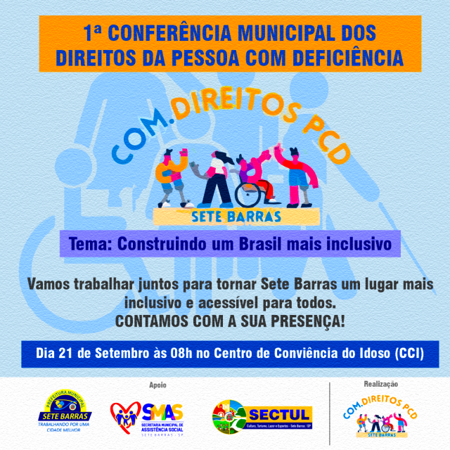 O Conselho Municipal dos Direitos das Pessoas com Deficiência (CMDPcD) convida você para participar da 1ª Conferência Municipal dos Direitos das Pessoas com Deficiência de Sete Barras, com o tema: "Construindo um Brasil mais Inclusivo". O evento será realizado no Centro de Convivência do Idoso (CCI), ao lado da Câmara Municipal, no dia 21 de setembro de 2023 a partir das 08h00.