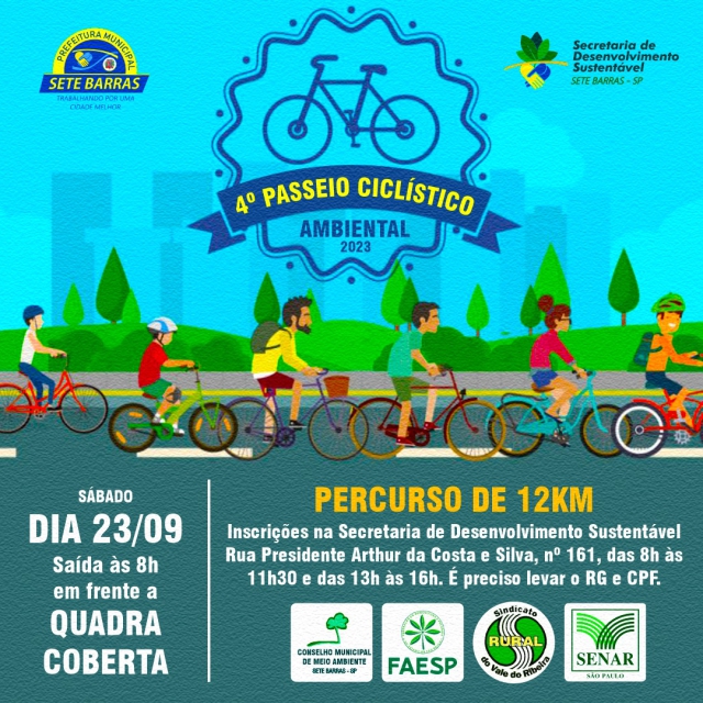 Vamos pedalar? A Prefeitura de Sete Barras por meio da Secretaria de Desenvolvimento Sustentável em parceria com o SENAR, FAESP, Conselho Municipal de Meio Ambiente e Sindicato Rural do Vale do Ribeira realizará no próximo dia 23 de Setembro, sábado, o 4º Passeio Ciclístico Ambiental, com um percurso de 12 km, o evento promete agradar aos participantes que poderão curtir com amigos e famílias o início do sábado sobre duas ruas, a concentração será em frente ao Ginásio Poliesportivo a partir das 8h.