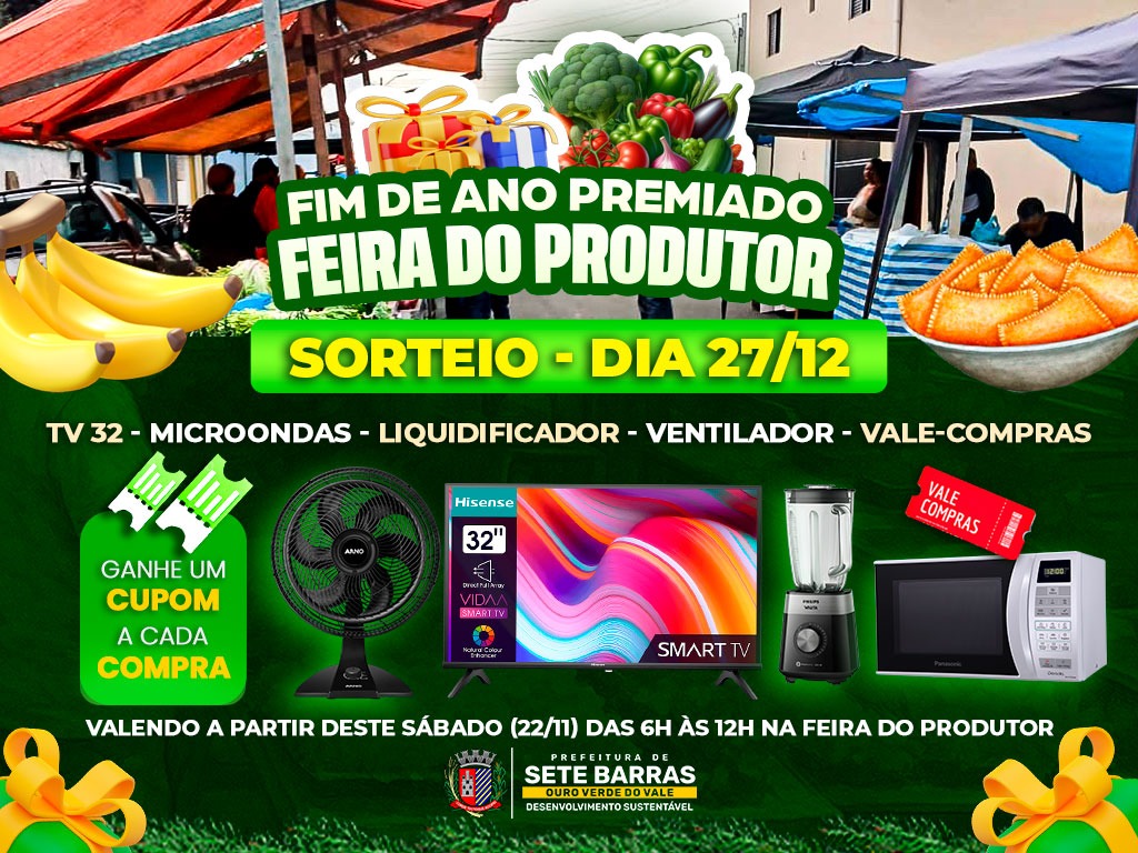 Para proporcionar um final de ano especial aos moradores e valorizar ainda mais quem prestigia a feira, os feirantes da Feira do Produtor Rural de Sete Barras se uniram e lançaram a promoção “Fim de Ano Premiado”. A iniciativa, que já está valendo desde o último sábado, dia 22/11, é realizada em parceria com a Prefeitura e oferece aos consumidores a chance de concorrer a diversos prêmios ao realizar compras entre 6h e 12h, diretamente com os feirantes participantes.