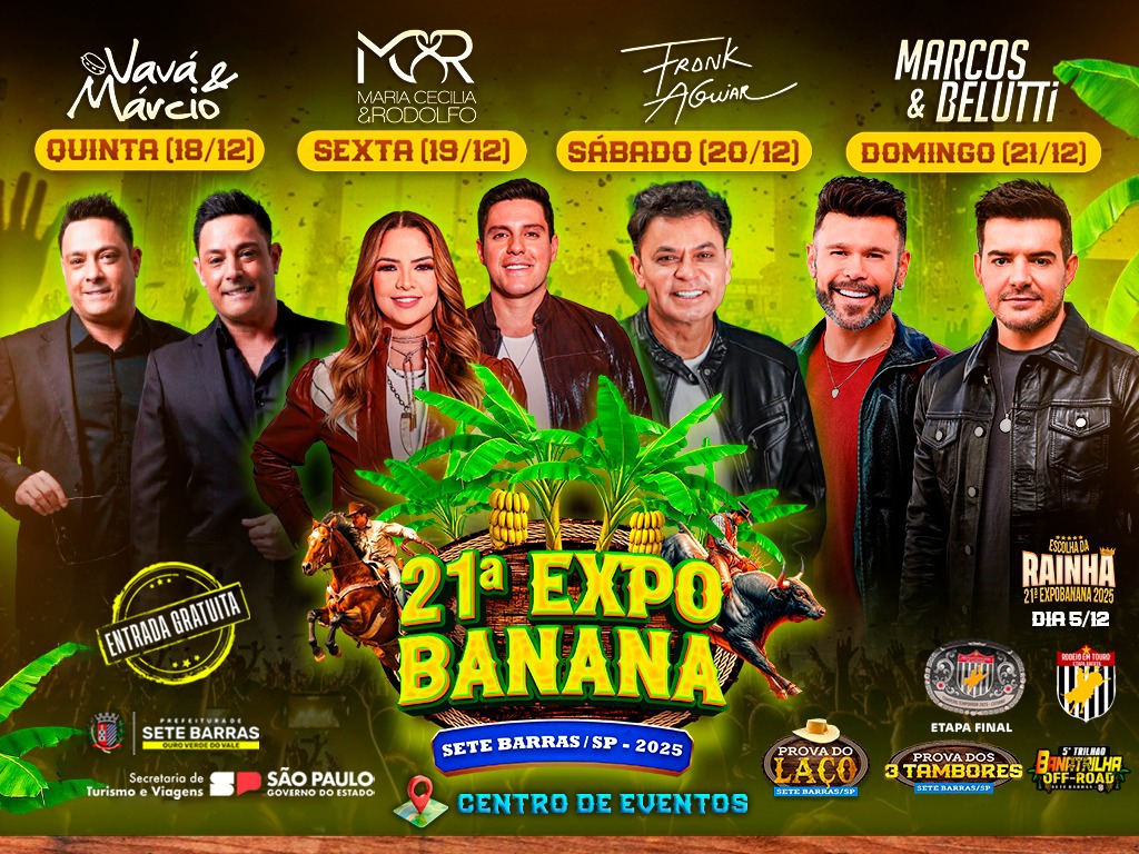 A espera acabou! A Prefeitura de Sete Barras definiu a programação oficial da 21ª ExpoBanana, que acontecerá de 18 a 21 de dezembro, no Centro de Eventos. Reconhecida como a festa mais animada do Vale do Ribeira e a última grande celebração do ano na região, a ExpoBanana chega com uma programação repleta de shows nacionais, atrações culturais, competições tradicionais e atividades para toda a família. Com entrada gratuita, o evento que conta com o apoio da Secretaria de Turismo e Viagens do Estado de São Paulo reforça o compromisso do município em valorizar a agricultura familiar, incentivar o empreendedorismo e proporcionar lazer e cultura à população.
