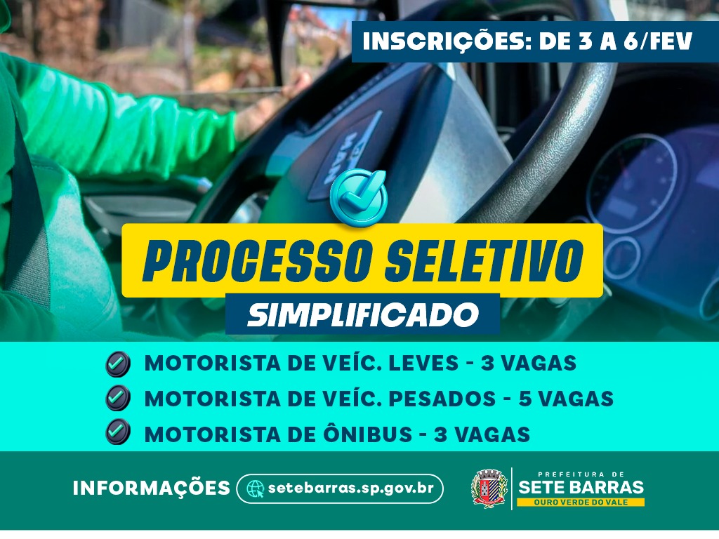 A Prefeitura de Sete Barras abriu, nesta terça-feira (3 de fevereiro), o Processo Seletivo Simplificado para a contratação de motoristas por prazo determinado, conforme a necessidade da administração pública. As inscrições seguem até o dia 6 de fevereiro e devem ser realizadas presencialmente no Paço Municipal, das 8h às 11h e das 13h30 às 17h.