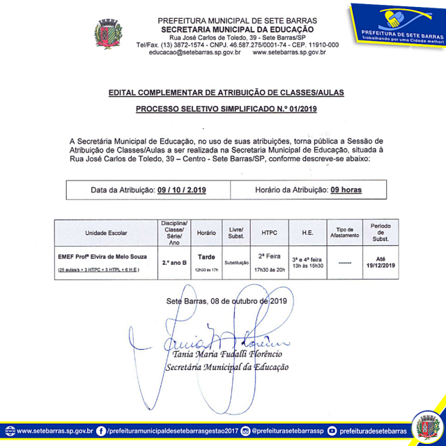 A Secretária Municipal de Educação, no uso de suas atribuições, torna pública a Sessão de Atribuição de Classes/Aulas a ser realizada na Secretaria Municipal de Educação, situada à Rua José Carlos de Toledo, 39 Centro - Sete Barras/SP.