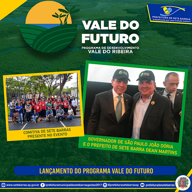 Na manhã desta quinta-feira (17), no Auditório Ulysses Guimarães no Palácio dos Bandeirantes em São Paulo, o prefeito Dean Martins, acompanhado pela primeira-dama Jeany Fudalli, o vice-prefeito Jorge Kiyoharu, secretários, diretores, membros do CCI e moradores de Sete Barras participaram do lançamento do Programa de Desenvolvimento para o Vale do Ribeira VALE DO FUTURO, que tem como objetivo a geração de emprego, renda e qualidade de vida nas cidades do Vale do Ribeira.