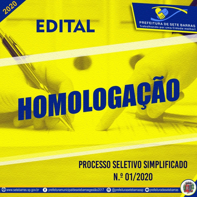 O Prefeito do Município de Sete Barras, Dean Martins, usando de suas atribuições legais em vigor, torna pública a HOMOLOGAÇÃO do Processo Seletivo Simplificado n.º 01/2020 para os empregos de Professor de Educação Básica (Educação Infantil e Fundamental), Professor de Educação Básica (Atendimento Educacional Especializado) e Professor de Educação Básica Cadastro de Reserva para o 6.º ao 9.º Ano - (Língua Portuguesa; Matemática; História; Geografia; Ciências; Educação Física; Arte; Língua Estrangeira Moderna (Inglês), com publicação do extrato do edital no Jornal Notícias do Vale, em 23 de janeiro de 2020, tendo em vista a conclusão dos trabalhos relativos aos empregos supracitados do certame em tela, após cumprimento de todas as etapas previstas, prazos recursais e demais exigências constantes do Edital de Abertura. O prazo de validade do Processo Seletivo, para os empregos supracitados, será de 1 (um) ano, contado a partir da data de sua homologação, podendo ser prorrogado por igual período segundo interesse da Administração. E para que chegue ao conhecimento dos interessados, é expedido o presente Edital.