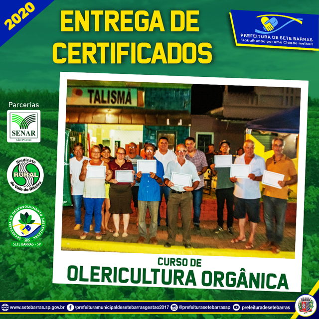 A Prefeitura de Sete Barras em parceria com o SENAR através do Sindicato Rural do Vale do Ribeira e a Associação do Bairro Santa Cruz, realizaram o curso, foram 08 meses de aprendizagem das técnicas de cultivo orgânico de hortaliças, viabilizando a agregação de valor nos produtos, produzidos de forma sustentável sem a utilização de agrotóxicos.