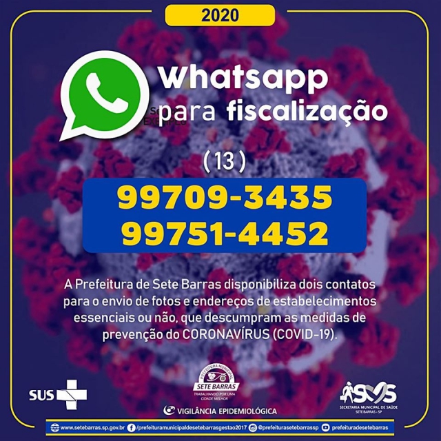 Para facilitar a regularização e obediência às normas, visando sempre a defesa da vida e o controle do contágio do Sete Barrenses, a prefeitura disponibiliza contatos via whatsapp, como ferramenta e forma de contar com a colaboração da população.
