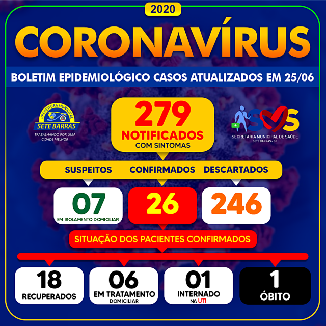 A Secretaria Municipal de Saúde e a Vigilância Epidemiológica apresentam os números da COVID-19 dessa quinta-feira, 07 casos suspeitos, 26 confirmados e 246 descartados. Dos 26 confirmados, 1 internado (na UTI), 6 em quarentena (tratamento domiciliar), 18 recuperados e 1 óbito.