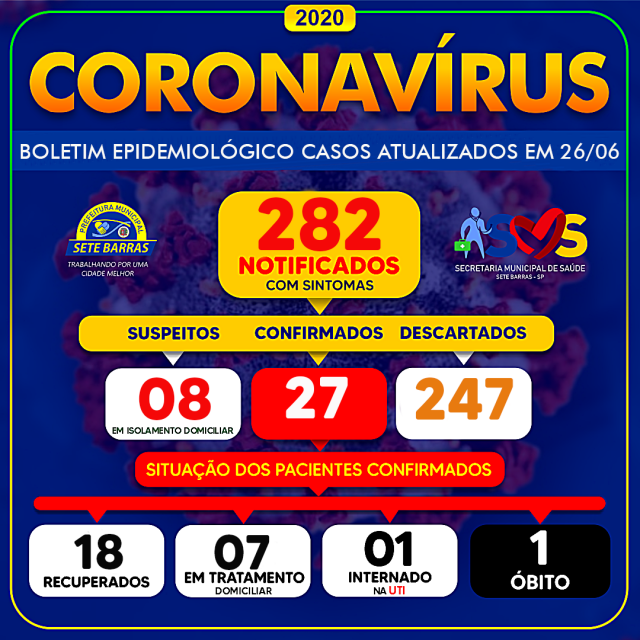 A Secretaria Municipal de Saúde e a Vigilância Epidemiológica apresentam os números da COVID-19 dessa quinta-feira, 08 casos suspeitos, 27 confirmados e 247 descartados. Dos 27 confirmados, 1 internado (na UTI), 7 em quarentena (tratamento domiciliar), 18 recuperados e 1 óbito.