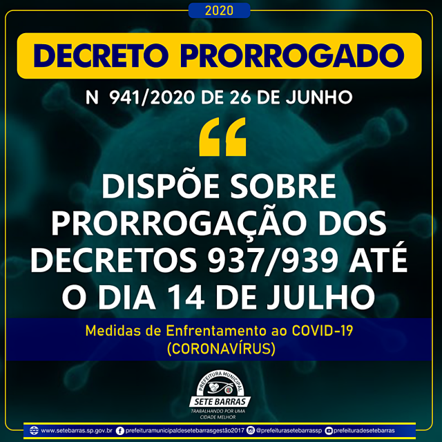 Dispõe sobre a prorrogação das medidas temporárias de prevenção ao contágio pelo COVID-19 (novo Coronavírus) no âmbito do Município de Sete Barras, instruídas pelos Decretos n° 937 e 939/2020.