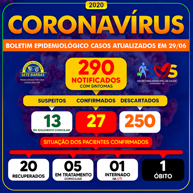 A Secretaria Municipal de Saúde e a Vigilância Epidemiológica apresentam os números da COVID-19 dessa segunda-feira, 13 casos suspeitos, 27 confirmados e 250 descartados. Dos 27 confirmados, 1 internado (na UTI), 5 em quarentena (tratamento domiciliar), 20 recuperados e 1 óbito.