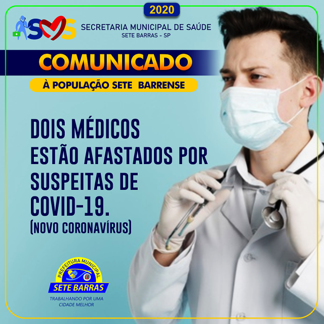 A Prefeitura de Sete Barras e a Secretaria Municipal de Saúde comunicam à população que dois médicos da linha de frente ao combate do NOVO CORONAVÍRUS foram afastados por suspeitas do COVID-19, seguindo todas as normas do Ministério da Saúde.