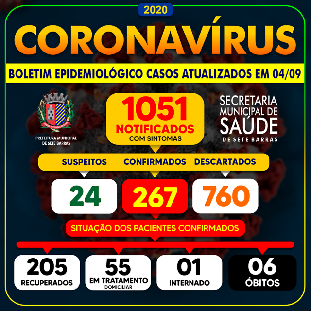 A Secretaria Municipal de Saúde e a Vigilância Epidemiológica apresentam os números da COVID-19 dessa sexta-feira, 24 casos suspeitos, 267 confirmados e 760 descartados. Dos 267 confirmados, 55 em quarentena (tratamento domiciliar), 205 recuperados, 01 internado e 06 óbitos.