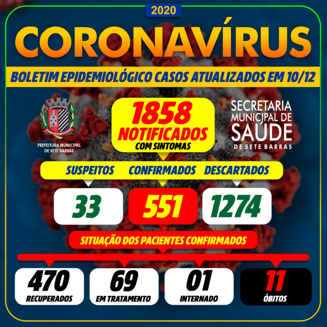 A Secretaria Municipal de Saúde e a Vigilância Epidemiológica de Sete Barras apresentam os números da COVID-19 dessa quinta-feira, 33 casos suspeitos em isolamento domiciliar, 551 confirmados e 1.274 descartados. Dos 551 confirmados, 69 em quarentena (tratamento domiciliar), 470 recuperados, 01 internado e 11 óbitos.