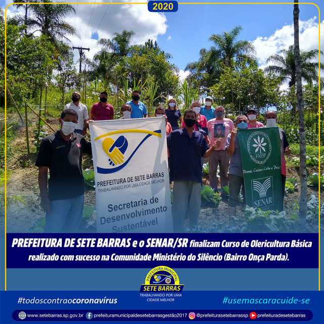 A parceria entre a Prefeitura de Sete Barras e o SENAR/SR beneficiou mais uma comunidade com o Curso de Olericultura Básica, produtores da Comunidade Ministério do Silêncio do Bairro Onça Parda participaram ativamente e levam na bagagem conhecimento técnicos para a lavoura com o manejo de hortaliças, visando aumento de produção, produtividade e qualidade.