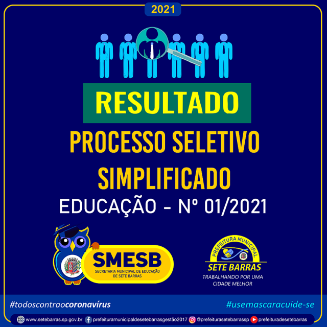 A Prefeitura de Sete Barras através da Secretaria Municipal de Educação divulga o resultado do PROCESSO SELETIVO SIMPLICADO Nº 001/2021.