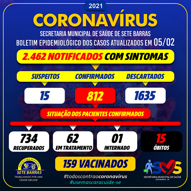 A Secretaria Municipal de Saúde e a Vigilância Epidemiológica de Sete Barras apresentam os números da COVID-19 dessa sexta-feira, 15 casos suspeitos em isolamento domiciliar, 812 confirmados e 1.635 descartados. Dos 812 confirmados, 62 em quarentena (tratamento domiciliar), 734 recuperados, 01 internado e 15 óbitos.