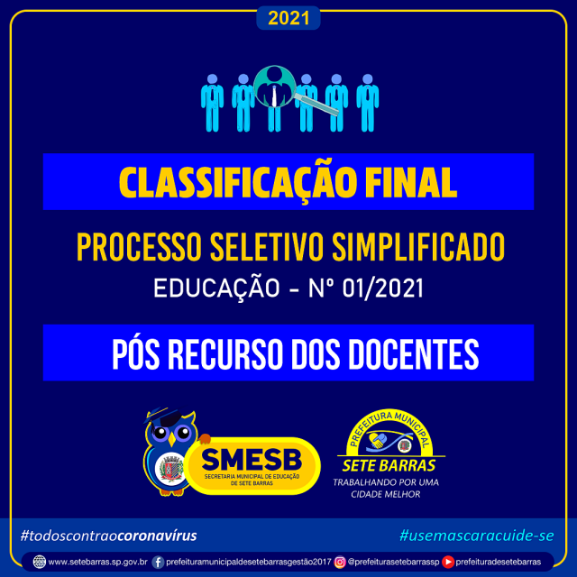 A Prefeitura de Sete Barras por meio da Secretaria Municipal de Educação torna público o resultado da Classificação Final Pós Recurso do Processo Simplificado de nº 01/2021.