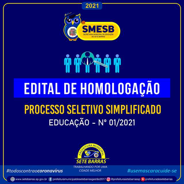 O Prefeito do Município de Sete Barras/SP, Estado de São Paulo, usando de suas atribuições legais em vigor, torna pública a HOMOLOGAÇÃO do Processo Seletivo Simplificado n.º 01/2021 para os empregos de Professor de Educação Básica I e II (Educação Infantil e Fundamental), Professor de Educação Básica II AEE - Atendimento Educacional Especializado e Professor de Educação Básica III Especialistas Cadastro de Reserva para o 6.º ao 9.º Ano - (Língua Portuguesa; Matemática; História; Geografia; Ciências; Educação Física; Arte; Língua Estrangeira Moderna (Inglês), com publicação no site da Prefeitura Municipal de Sete Barras (SP) (www.setebarras.sp.gov.br), tendo em vista a conclusão dos trabalhos relativos aos empregos supracitados do certame em tela, após cumprimento de todas as etapas previstas, prazos recursais e demais exigências constantes do Edital de Abertura. O Processo Seletivo Simplificado terá validade até o ultimo dia letivo de 2021, para os empregos supracitados. E para que chegue ao conhecimento dos interessados, é expedido o presente Edital.